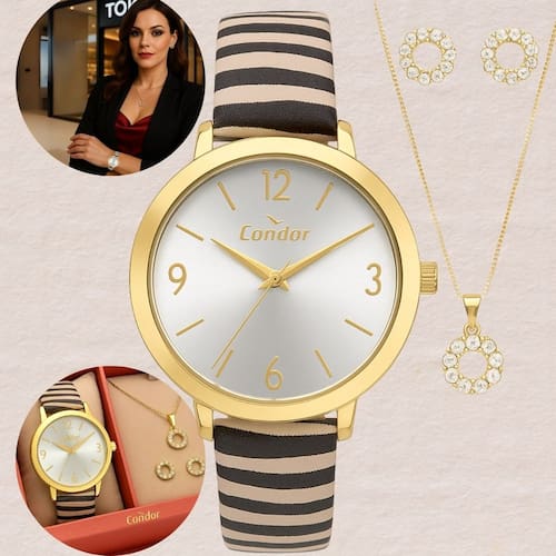O Kit Relógio Condor Feminino Dourado é o equilíbrio perfeito entre sofisticação e ousadia. Seu design combina uma caixa metálica dourada de 3,8 cm com mostrador prateado minimalista e pulseira com estampa animal print, trazendo estilo moderno sem perder a elegância. Acompanha colar e brincos com detalhes circulares que reforçam o charme do conjunto, tornando-o ideal para quem deseja brilhar em todas as ocasiões. Com resistência à água de até 30 metros e vidro em cristal mineral, o modelo oferece durabilidade e conforto para o dia a dia. Um acessório que traduz atitude, beleza e praticidade em cada detalhe.