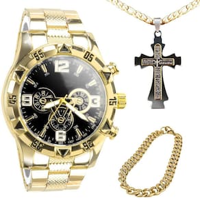 Especificações técnicas: - Relógio masculino dourado à prova d'água - Fundo preto - Material: aço inoxidável banhado a ouro 18k - Cordão grumet em aço banhado 18k aprox. 60cm - Pingente grande em forma de cruz aprox. 4cm - Pulseira grumet grossa banhada 18k aprox. 21cm Ean: 7899705557390