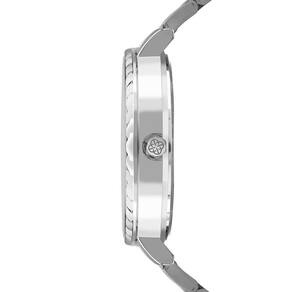 O relógio possui caixa redonda de 40mm com aro trançado em relevo e mostrador com fundo texturizado de glitter prata, garantindo um toque glamouroso e moderno. Os marcadores romanos reforçam a sofisticação do modelo, enquanto a pulseira em aço com elos prateados completa o design com elegância e conforto.