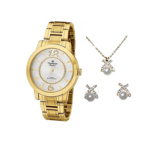 Kit Relógio Feminino Champion + Brinco e Colar CH24259D Relógio Feminino Champion que acompanha um lindo colar e par de brincosRelógio para mulheres de bom gostoToda mulher se sente mais linda usando um relógioSeu relógio é enviado na caixa de luxo da Champion e com manual de instrução.Acompanha um kit de semi joias Características:EAN: 7895244079140Marca: Champion Modelo: CH24259DCor da Pulseira: DouradoCor da Caixa: DouradoCor do fundo: PrataMaterial da Pulseira: AçoResistênte à água: 5 ATMKit Contém 1 Relógio, 1 Colar e 1 par de BrincosDimensões da Embalagem:Altura: 9cmLargura: 12cmProfundidade: 12cmPeso: 0,400KgGarantia: 12 Meses Marca: Não Informado