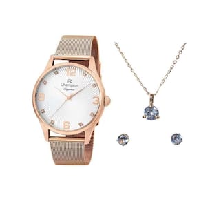 Kit Relógio Feminino Champion + Brinco e Colar CN25716X Relógio Feminino Champion que acompanha um lindo colar e par de brincosRelógio para mulheres de bom gostoToda mulher se sente mais linda usando um relógioSeu relógio é enviado na caixa de luxo da Champion e com manual de instrução.Acompanha um kit de semi joias Características:EAN: 7895244080030Marca: Champion Modelo: CN25716XCor da Pulseira: RoseCor da Caixa: RoseCor do fundo: PrataMaterial da Pulseira: AçoResistênte à água: 5 ATMKit Contém 1 Relógio, 1 Colar e 1 par de BrincosDimensões da Embalagem:Altura: 9cmLargura: 12cmProfundidade: 12cmPeso: 0,400KgGarantia: 12 Meses