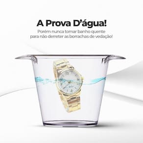 Kit Relógio Feminino Prova Água Banhado +Colar/Brincos. O relógio analógico feminino dourado é banhado a 18k, à prova d'água e feito em aço inoxidável. O colar banhado possui um pingente em strass transparente. Os brincos são banhados e possuem pedrinha de strass transparente. Inclui uma pulseira banhada com vários strass transparentes. O kit é enviado em uma caixa Orizom Maria Premium. Ideal para presentear em diversas ocasiões. Garantia de 3 meses.