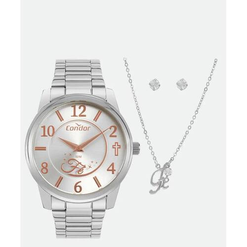 Kit Relógio Feminino Condor CO2034AH/K4K Kit Relógio feminino, com sistema analógico indicando as horas, minutos e segundos. Caixa em metal, vidro em cristal mineral e botões para ajuste de horas. Mostrador personalizado com indicadores numéricos e tracejados. Pulseira em aço trabalhado com fechamento por botão na lateral. - Acompanha colar e par de brincos. Resiste à água: 5ATM ou 50 metros Composição do Vidro: cristal mineral Material da Caixa: metal Material da Pulseira: aço Medidas aproximadas: - Largura da caixa, incluindo pino: 4,3cm - Espessura da caixa: 1cm - Comprimento da pulseira: 17cm Informações Adicionais: Tamanho: único Cor: prateado Modelo: Kit Relógio Feminino Condor CO2034AH/K4K Material: aço Detalhes adicionais: relógio, analógico Marca: Condor Foto realizada com tamanho: único Categoria: Moda Feminina - Acessórios - Relógios - Fashion - Acompanha estojo com 1 Relógio, 1 Manual de instruções e Certificado de . Marca: Não Informado Ean: 7891530813368