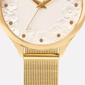 Kit relógio feminino com sistema analógico com ponteiros indicando as horas, minutos e segundos. Caixa em metal com vidro em cristal mineral e pino para ajuste de horas. Mostrador personalizado com flores e indicadores ponteados. Pulseira em aço trabalhado com fechamento por gancho.