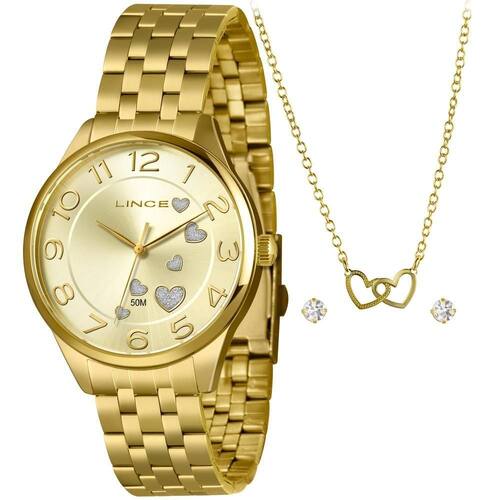 O Kit Relógio Feminino Lince LRGH245L40 K0E6C2KX é perfeito para quem busca um conjunto elegante e cheio de charme. O relógio possui caixa de 40mm, mostrador champagne com detalhes em formato de corações prateados e pulseira em aço dourado, proporcionando um visual sofisticado e delicado.
