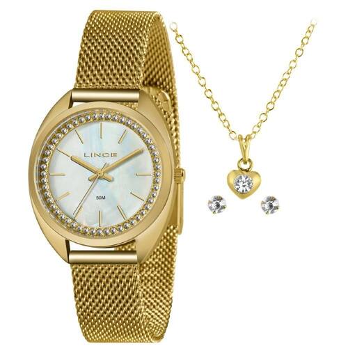 O Kit Feminino Lince LRG4701L KO80B1KX une sofisticação e delicadeza em um conjunto completo para presentear ou se presentear. O relógio possui caixa dourada de 37mm, aro cravejado de pedras que adicionam brilho elegante e mostrador madrepérola, que reflete charme e exclusividade.