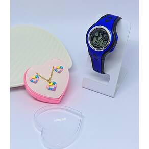 Kit Relógio Infantil Digital Luz Led Colorido Esporte Meninas Cronometro + Conjunto Colar e Brincos Aço Delicado - Cor: Azul