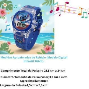 Relógio Pisca Luz Colorida que Toca Música + Laço de Cabelo Infantil Presilha Bico de Pato – Disney Stitch, Lilo & Angel Surpreenda os pequenos com a magia e a diversão do universo Disney! Este conjunto encantador traz o Relógio Pisca Luz Colorida que toca música, acompanhado de um delicado Laço de Cabelo Infantil, perfeito para meninos e meninas que adoram um toque especial no dia a dia. ? Relógio Pisca Luz Colorida – Diversão e Encanto a Cada Piscar! Design vibrante e divertido: mostrador redondo de 38mm com LEDs coloridos que piscam, criando um visual mágico e alegre. Pulseira confortável: feita em silicone de alta qualidade, com 22cm de comprimento, perfeita para o uso diário sem incomodar. Funcionalidades completas: exibe hora, data e segundos, com três botões intuitivos para fácil ajuste. Música e luz: toca músicas que encantam, tornando cada momento mais especial para os pequenos. Leve e resistente: caixa em plástico leve e durável, com fecho em fivela seguro e prático. Importante: não é resistente à água, evite submersão para preservar o produto. ? Laço de Cabelo Infantil Presilha Bico de Pato – Encanto e Segurança Design Disney encantador: com pingente de 4 cm dos personagens Stitch, Lilo e Angel, trazendo magia para o visual da criança. Presilha jacaré: firme e confortável, garantindo que o laço permaneça no lugar durante toda a diversão. Materiais premium: fitas de alta qualidade, proporcionando durabilidade e acabamento sofisticado. Peso leve: apenas 100g, para que as meninas possam brincar e se divertir sem desconforto. Medidas: laço com 15 cm, ideal para complementar o look infantil. Por que escolher este conjunto? Este kit é muito mais que um acessório, é uma verdadeira experiência lúdica que une estilo, música e cores vibrantes, perfeito para presentear ou para tornar o dia a dia das crianças ainda mais alegre. Pacote inclui: 1 Relógio Pisca Luz Colorida com música (cor enviada aleatoriamente conforme estoque) 1 Laço de cabelo infantil Stitch, Lilo ou Angel (modelo enviado aleatoriamente) Atenção: O envio será realizado em até 24 horas úteis após a confirmação do pagamento. A cor do relógio e do laço será enviada conforme disponibilidade em estoque. Dúvidas? Conte com a nossa equipe para ajudar! Garanta agora o relógio que vai iluminar e animar o dia a dia dos seus pequenos com muita cor e música!