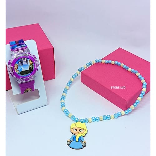 Kit Relógio Infantil Digital Pisca Luz Led Colorido Princesas + Colar Miçangas com Pingente 3D Personagens Disney Moda - Cor: Frozen