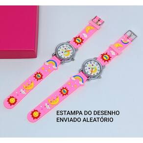 Design Exclusivo em 3D com desenhos animados que encantam e despertam a imaginação. Mostrador redondo com movimento quartz analógico, ideal para ajudar os pequenos a aprenderem a ler as horas com precisão. Pulseira em silicone ajustável, confortável e resistente para acompanhar o ritmo agitado do dia a dia infantil. Bisel em aço inoxidável, garantindo durabilidade e acabamento de alta qualidade. Resistente a respingos d’água (30m), perfeito para aventuras, mas lembre-se: não é indicado para banho ou natação. Tamanho ideal: 19 cm de comprimento, mostrador de 2,5 cm de diâmetro e peso super leve de apenas 35g. Estampas enviadas aleatoriamente, tornando cada relógio uma surpresa única!