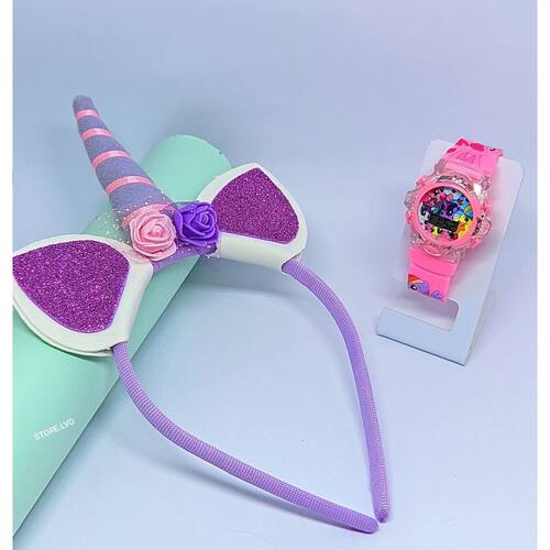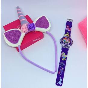Kit Relógio Infantil Menina Digital Pisca Luz Led Musica + Tiara Arquinho Cabelo Princesas Disney Presente Lembrancinha - Cor: Pony