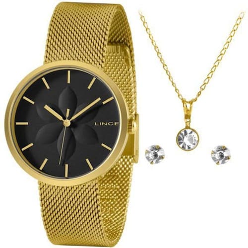 Kit Relógio Lince Feminino Lrgh154L Kz76 + Colar E Brincos Garanta seu acessório ou presenteie quem você ama com um preço especial e com produtos originais e de qualidade. Marca: Lince Gênero: Feminino Material da Pulseira: Metal Material da Caixa: Aço inoxidável Cor do relógio: Dourado Cor do mostrador: Preto Cor da Caixa: Dourado Medida da caixa: 37 mm com o pino Resistência à água: 5 ATM Analógico Produto Original Acompanha nota fiscal. Acompanha Colar e Brincos.