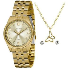 Kit Relógio Lince Feminino Lrgj136L Kz39 + Colar E Brincos Garanta seu acessório ou presenteie quem você ama com um preço especial e com produtos originais e de qualidade. Marca: Lince Gênero: Feminino Material da Pulseira: Aço inoxidável Material da Caixa: Aço inoxidável Cor do relógio: Dourado Cor do mostrador: Dourado Cor da Caixa: Dourado Medida da caixa: 37 mm com o pino Resistência à água: 5 ATM Analógico Produto Original Acompanha nota fiscal. Acompanha Colar e Brincos.