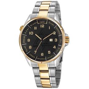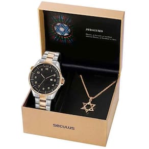 Este kit é composto por um relógio todo em aço, com folheação prata e dourada com visor preto e destaque para o símbolo da estrela de Davi em seu interior. Possui a caixa arredondada, aro interno giratório com as datas do calendário judaico. Acompanha um colar com pingente da estrela de Davi. Ambos vêm em embalagem especial da Seculus. Original com garantia de 12 meses. Acompanha embalagem Seculus, certificado, manual e nota fiscal.
