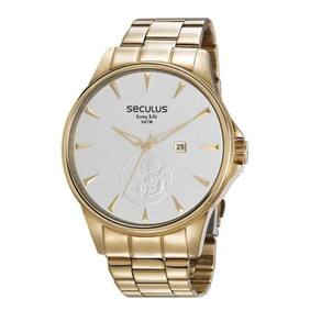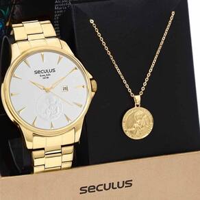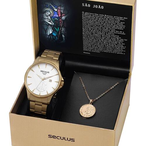 Marca: Seculus Linha: Fé - kit Especial Modelo: Relógio Masculino Seculus São João Modelo alfanumérico: 35015GPSKDA1K1 Gênero: Masculino Cor da caixa: Dourado Material da correia: Aço inoxidável Cor do disque do ponteiro de horas: Dourado Cor do disque do ponteiro dos minutos/segundos: Dourado Cor dos subdials: Dourado Cor da luz: não se aplica Modelo detalhado: Relógio Masculino Seculus São João 35015GPSKDA1K1