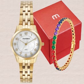 O kit Mondaine 32796LPMKDE1K2 traduz sofisticação e feminilidade em cada detalhe. O relógio dourado apresenta mostrador em madrepérola com numeração completa e acabamento metálico refinado, proporcionando brilho sutil e elegância atemporal. A pulseira em aço inoxidável dourado garante conforto, resistência e harmonia visual. Acompanha uma pulseira com pedras coloridas lapidadas em tons de verde, azul, lilás e rosa, que adiciona um toque moderno e vibrante ao conjunto. Ideal para mulheres que valorizam estilo e versatilidade, o kit é perfeito tanto para o dia a dia quanto para ocasiões especiais. Com resistência à água de até 5 ATM, une beleza, praticidade e durabilidade — uma expressão refinada do design Mondaine.