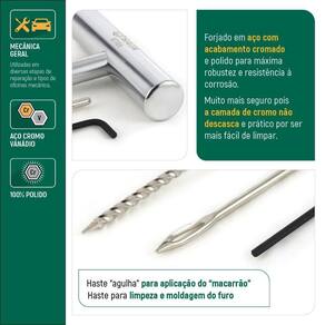 Produto: Kit reparo de pneus sem câmera com 5 peças - ST97106 Marca: Sata Descrição: O Kit reparo de pneus sem câmera com 5 peças ST97106 da Sata fabricado em aço cromo vanádio, garante muito mais segurança e qualidade na realização dos reparos de pneus sem câmara; Sua empunhadura robusta conta com sistema de troca das hastes sendo uma haste para limpeza e moldagem do furo e outra haste "agulha" para aplicação do "macarrão". Facilmente removíveis por uma chave hexagonal. Características e Benefícios • Forjado em aço com acabamento cromado e polido para máxima robustez e resistência à corrosão. • Muito mais segura pois a camada de cromo não descasca e prática por ser mais fácil de limpar. • Fabricado em Aço Cromo-Vanádio Cr-V Neste jogo acompanha:• Chave Hexagonal para troca de haste;• Haste "agulha" para aplicação do "macarrão";• Haste para limpeza e moldagem do furo;• Corpo Metálico Ultra resistente em aço cromo vanádio.Especificações: 5 PeçasItens Inclusos: Chave allen,Haste "agulha",Cabo T escareador ,2 "macarrão" para reparos. Marca: Não Informado Ean: 7891645132903