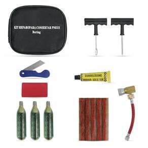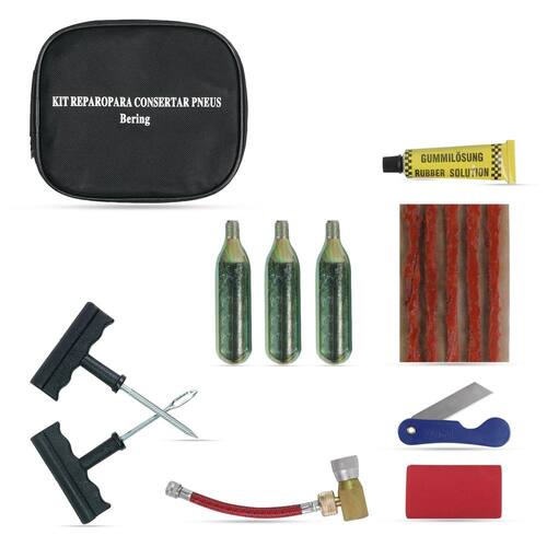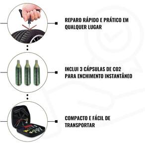 Mais do que um simples kit de reparo, ele oferece todas as ferramentas necessárias para consertar pneus de motocicleta pelo processo de vulcanização à frio, incluindo mini estilete, cola, escareador e plugs de reparo, além de 3 cápsulas de CO2 para reinflar o pneu rapidamente.