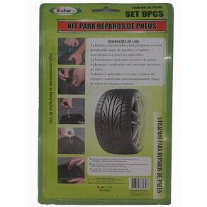 -kit reparo com 9 peças . -1 Escariador de Ferro cromado 15 cm. -1 Aplicador de reparo de Ferro cromado 15 cm. -1 Tudo de cola 12g. -5 Reparos (comprimento 10cm). -1 Estilete. -Utilizar em pneus sem câmara. -Não repare furos maior que 5mm. -Não repare furo na lateral. -Armazenar em local fresco. -Manter fora do alcance das crianças