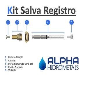 -marca: alpha hidrometais -instalação: banheiro, chuveiro -material reparo: metal com pistão cromado -tipo: salva registro sem acabamento 7 x 1 -kit instalação: 01 reparo registro rosca n 18 com pistão cromado E 03 buchas sos n 19,20,21,22,23 e 24 -acessórios: 01 vedante, 01 parafuso e 01 guarnição de boracha -acabamento: não acompanha