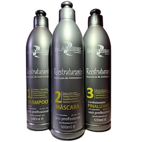 Máscara Reestruturante 500ml: Com queratina e PH balanceado nutre e revitaliza os cabelos desnutridos e sensibilizados por químicas sucessivas.