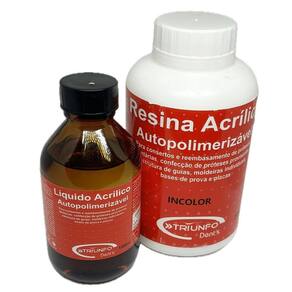 Kit Resina Acrílica Auto Pó Incolor 80g + Líquido 100ml Cola Triunfo Resina Acrílica Auto Polimerizante KIT Líquido 100ml + PÓ INCOLOR 80g ODONTOLOGIA - Reembasamentos - Consertos e adições de próteses e PPR - Confecção de próteses imediatas provisórias - Confecção de moldeiras individuais - Confecção de bases de prova de - Confecção de placas inter oclusais - Confecção de guias cirúrgicos REPAROS GERAIS - Reparos automotivos - Carcaças de Notebook - Videogames - Modelos de silicone - Reparos em peças de plástico em geral INFORMAÇÕES TÉCNICAS - Registro na ANVISA: 80772730007 O que vem na caixa - 1 Frasco LÍQUIDO 100ml - 1 Frasco PÓ INCOLOR 80g Marca: Não Informado Ean: 7794756817625