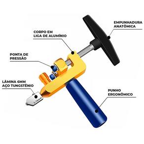 Kit Riscador Cortador De Vidro Granito Cerâmicas e Porcelanato Corta azulejos e cerâmica, abridor de azulejos de vidro, ferramenta de construção multifuncional - Marca: Charbs - Referência: CH00314 - Materiais aptos: Cerâmica, Piso, Vidro, aquário, espelho. - Espessura máxima de corte: 15mm - Gama do cortador de vidro em dois: vidro, azulejo, corte espelhado. - O design da alça superior torna mais fácil se cansar e é mais confortável de segurar, com um botão estendido para facilitar a introdução. - Aumente o diâmetro da roda do cortador de metal de 6 mm para 3 a 15 mm, para um corte preciso e uma operação eficiente - Material: liga de alumínio + ps plástico - Dimensões da embalagem: 19 x 13 x 6 cm - Peso bruto: 330 gramas Itens inclusos: - 1 Corpo cortador de vidro - 3 Lâminas de Corte 3 a 15mm 1 instalada + 2 reserva - 4 Pés de apoio - 1 Pinho Ergonômico Marca: Não Informado