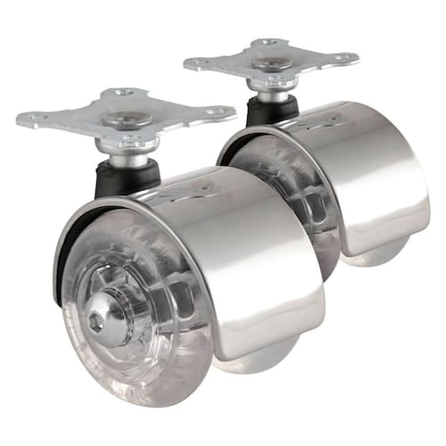 Rodizio em pu cristal conhecido como roda de silicone de Ø50mm Rodinha dupla Capa cromada Valor do kit 02 peças Especificações Técnicas: Diâmetro: 50mm Capacidade de Carga: 45 Kg Altura Total: 70mm Fixação: Chapa plana Sugestões de Aplicação: Cachepôs, suporte de vasos, fruteiras, porta-botijão, aspiradores de pó, racks, estantes, puffes, berços, pés de cama, gaveteiros, mesa de cabeceira, armários, gabinetes, mesas de centro, suportes de CPU, suportes de soro, biombos e móveis em geral. Marca: Não Informado