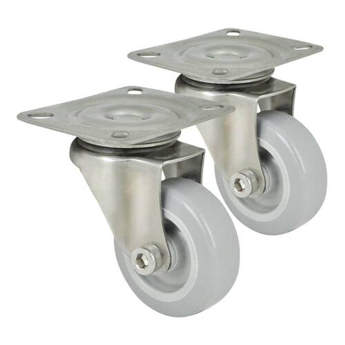Kit Rodizio industrial em Aço Inox Roda da linha pesada Ø75mm giratorio Anti risco Valor do kit 02 peçasDiâmetro: 75mmCapacidade de Carga: 80 KgAltura Total: 107mmFixação: Chapa planaSugestões de Aplicação:Mesas, armários para ferramentas, fornos, buffets, assadeiras, cozinhas industriais, carrinhos industriais, linha de refrigeração, equipamentos industriais, balcões frigoríficos, refrigeradores, expositores, gôndolas.