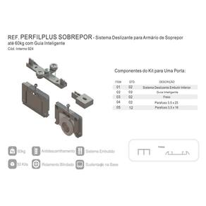 - Sistema Sobreposto. - Sustentação na Base. - Sistema com Rolamento. - Para Portas de Até 60 Kg. - Para Portas de Madeira ou Alumínio. - Para Portas com Espessura de 15 e 25 mm. - Kit para 01 Porta. - Parafusos indicados 3,5 x 14 CC / Parafuso 3,5 x 22 CC.
