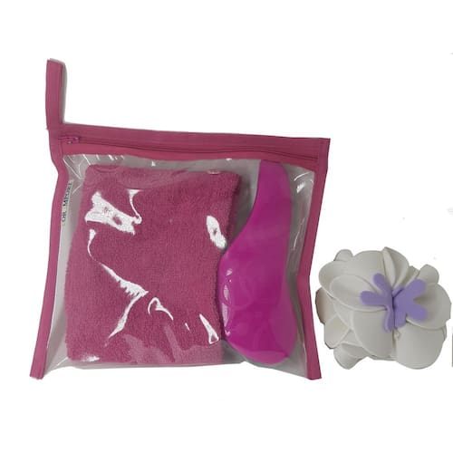 Kit rosa pink, vem com turbante para secar o cabelo atoalhado cru, ele reduz pela metade o tempo de secagem do cabelo ao absorver a água e ajuda a diminuir o frizz, ótimo para segurar o cabelo e não deixar cair sobre o rosto ou roupa, já que conta com um fechamento em botão e escova de cabelo mágica para cabelos grossos, cacheados e crespo, tira o emaranhado e nós dos fios sem quebrar. Possui algumas cerdas longas que desembaraçam, e outras curtas, que suavizam a cutícula do cabelo para aumentar o brilho e maciez. Além disso, elas são mais fortes, assim, desliza bem nos cabelos mais grossos e enrolados, estejam eles secos ou molhados.