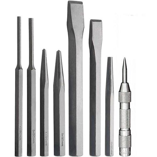 Aplicação: uso em oficinas mecânicas, borracharias, funilarias, indústria metal mecânica, indústria automobilistica e outros ambientes Kit: 8 peças 1 Talhadeira 16mm 5/8 1 Talhadeira 12mm 1/2 1 Saca - pino cônico 3mm 1/8 1 Saca - pino cônico 5mm 3/16 1 Saca - pino paralelo 3mm 1/8 1 Saca - pino paralelo 6mm 1/4 1 Punção de centro 5mm 3/16 1 Punção de centro automático