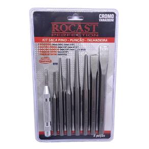O kit saca pino, punção e talhadeira 481,0001 - Rocast é uma combinação de ferramentas projetadas para diversas aplicações, como remoção de pinos, marcação e corte de materiais.