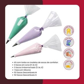 Kit especial Perfeito para quem está começando no mundo da cozinha ou deseja renovar seus utensílios com praticidade e qualidade. Conteúdo do kit: Manga para confeitar emborrachada g Manga para confeitar emborrachada m Manga para confeitar emborrachada p Manga para confeitar em lona g Manga para confeitar em lona m Manga para confeitar em lona p Saco para confeitar descartável - 50 unds grande Saco para confeitar descartável - 50 unds média Manga para confeitar em silicone