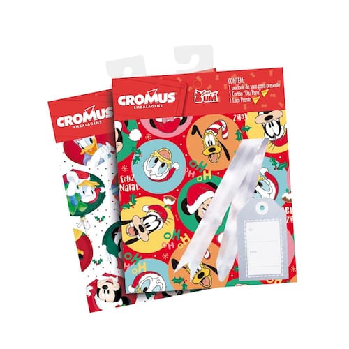 Torne seu Natal ainda mais encantador com o Kit Saco de Presente Natalino Cromus Disney! Com tamanho de 30x44cm, este kit é a escolha perfeita para quem busca praticidade sem abrir mão do charme e da magia das festas. Com personagens clássicos da Disney estampados em cores vibrantes, o saco de presente transforma qualquer mimo em uma surpresa inesquecível.Além do saco com design encantador, o kit inclui um laço fácil, que garante uma finalização rápida e elegante, sem complicações. Com apenas alguns segundos, você transforma seu presente em uma obra de arte natalina. E para dar um toque ainda mais personalizado, o kit acompanha um cartão De/Para, permitindo que você adicione uma mensagem especial e carinhosa para quem você ama.Ideal para embalar brinquedos, roupas, acessórios ou até guloseimas, o Kit Saco de Presente Cromus Disney é versátil e funcional, facilitando a tarefa de presentear com muito estilo e encanto. Economize tempo e surpreenda com uma apresentação impecável e cheia de magia Disney. Celebre o Natal com criatividade e alegria, fazendo cada presente brilhar com o espírito natalino e a diversão dos personagens mais amados do mundo!