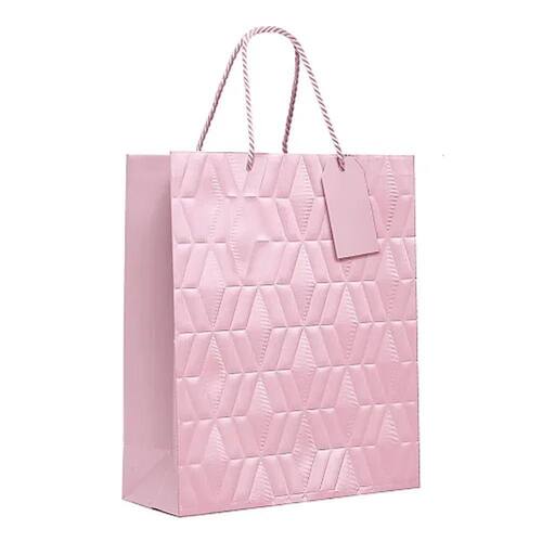 A Kit Sacola de Papel Premium Relevo Rosa Bebê M oferece um toque de charme e suavidade, ideal para pequenos presentes.