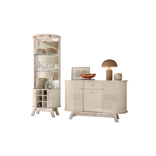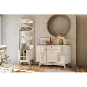 A composição une a Cristaleira Marina, perfeita para expor taças, louças e objetos decorativos, com o Buffet Monza, que oferece excelente espaço interno para organização da rotina.