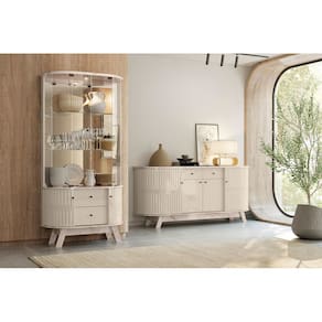 O Buffet Mônaco oferece excelente espaço interno com 4 portas, 2 gavetas e 3 prateleiras, sendo perfeito para manter tudo organizado no dia a dia. Já a Cristaleira Moss conta com portas de vidro deslizantes, prateleiras de vidro, espelhos e iluminação em LED, valorizando suas peças e trazendo destaque ao ambiente.