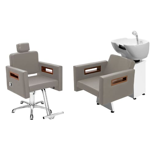 - 01 Cadeira Tunísia reclinável, base hidráulica, cabeçote ajustável e removível. - 01 Lavatório Tunísia sem apoio base branca/preta, base de ferro galvanizada, cuba de porcelana móvel, registro cromado com função monocomando, não acompanha aquecedor