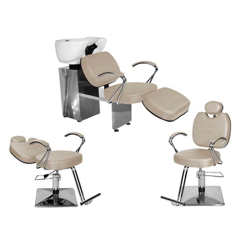 - 1 Lavatório Topázio Com Apoio Base Inox: com um design autêntico, acabamento em costura, assento amplo em espuma de alta densidade e apoio de pernas estofado com regulagem de altura que proporcionam conforto durante o atendimento, braços em ferro cromado com estofado, cuba de porcelana branca com ajuste de altura, ducha cromada e registro com função manocomando que trazem praticidade pra você durante a lavagem dos cabelos. Tudo isso com a alta resistência da base de ferro inox!