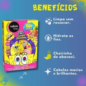 Desenvolvido pela SALON LINE, este kit oferece uma limpeza suave e eficaz, ao mesmo tempo em que hidrata e desembaraça os fios, deixando-os macios, brilhantes e fáceis de pentear. Com o aroma suave e a embalagem divertida do Bob Esponja, o Kit Salon Line Kids transforma a rotina de higiene em um momento de alegria. É a escolha ideal para pais que buscam produtos práticos e divertidos que cuidem da delicada pele e cabelo dos seus filhos, proporcionando benefícios imediatos como cabelos mais macios e fáceis de pentear, além de uma pele limpa e hidratada.