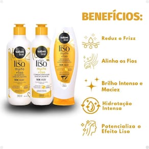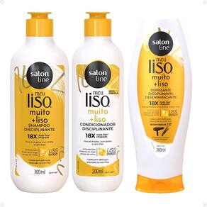 O Kit Salon Line Meu Liso Muito + Liso Disciplinante é a escolha perfeita para quem deseja um cabelo liso, hidratado, disciplinado e sem frizz. Com uma fórmula inovadora, esse kit é ideal para controlar o volume e garantir um liso perfeito, mantendo os fios alinhados e com brilho intenso o dia todo. O shampoo limpa suavemente os fios, removendo impurezas e mantendo a hidratação. Sua fórmula ajuda a controlar o volume, deixando os cabelos mais disciplinados e alinhados desde a primeira aplicação. O condicionador proporciona hidratação profunda e disciplina aos fios, deixando-os macios, sem frizz e com brilho intenso. Ele sela as cutículas dos fios, garantindo um liso mais controlado e um cabelo sedoso. defrizante desembaraçante é perfeito para proteger os fios contra o frizz e o calor, o defrizante também facilita o desembaraço, deixando o cabelo mais fácil de pentear e sem quebra. Ele ajuda a manter o liso por mais tempo, enquanto proporciona brilho e proteção extra. Este kit oferece um cuidado completo, desde a lavagem até a finalização, garantindo fios alinhados, sem frizz e com um liso duradouro. Ideal para quem deseja um liso perfeito, hidratado e com controle do volume, mantendo a suavidade e o brilho durante todo o dia.