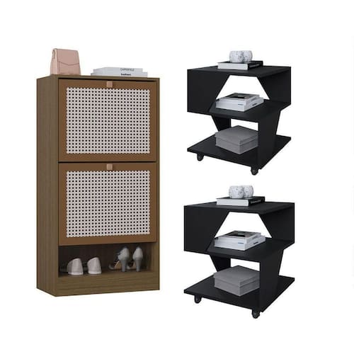 Design contemporaneo e cores modernas Estrutura em BP resistente e duravel Mesas com rodizios para facil movimentacao Sapateira com portas 3D imitando palha indiana Facil de montar produtos enviados desmontados
