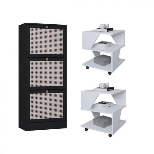 Kit Sapateira Spin Tropical 3 Portas E 2 Mesas De Cabeceira Branco/preto Kit Moveis Spin/Tropical 2 Mesas de Cabeceira + 1 Sapateira 3 Portas Poquema Leve funcionalidade, organizacao e estilo para sua casa com o Kit Tropical da Poquema Moveis, composto por 2 Mesas de Cabeceira e 1 Sapateira 3 Portas. Com design moderno e estrutura em BP (Laminado de Baixa Pressao), os moveis sao resistentes a riscos, umidade e manchas, garantindo durabilidade e facil manutencao.