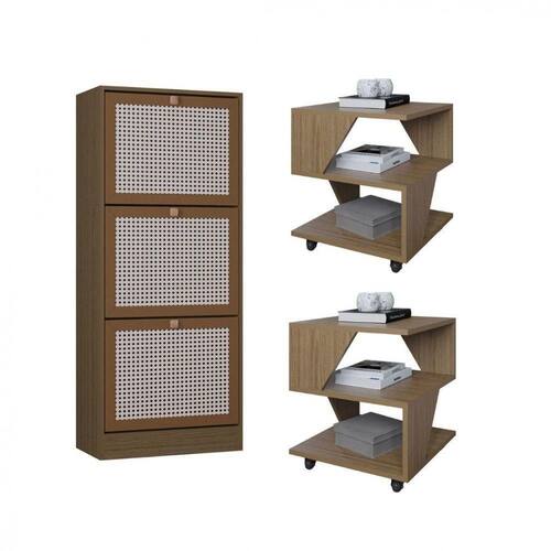 Destaques: Design contemporaneo e cores modernas Estrutura em BP resistente e duravel Mesas com rodizios para facil movimentacao Sapateira com portas 3D imitando palha indiana Facil de montar produtos enviados desmontados