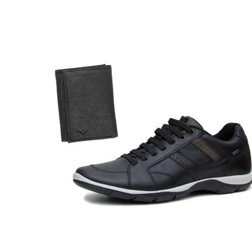 Kit Sapatenis Masculino Couro Ajuste Elastico Solado Borracha Com Carteira Porta Documentos - 44 - Preto