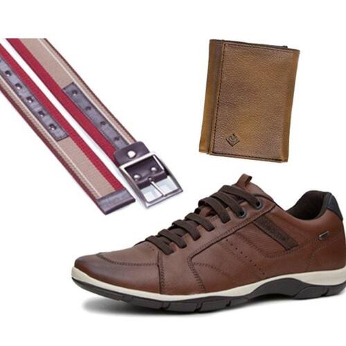 Kit Sapatenis Masculino Em Couro Ajuste Elastico Com Carteira Porta Documentos E Cinto Gorgurao - 44 - Marrom