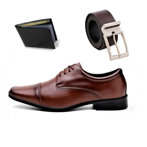 Kit Sapato Social Masculino Bico Quadrado Solado Borracha Com Cinto Dupla Face e Carteira Slim - 38 - Marrom Cacau