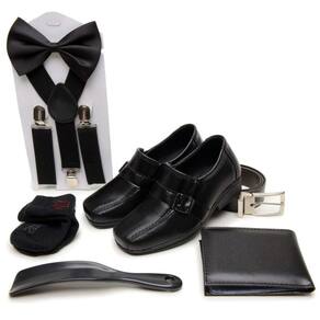 O kit é composto por 01 par de sapato, 01 cinto, 01 carteira, 01 meia, 01 suspensório e 01 calçadeira