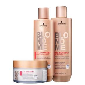 Kit Schwarzkopf All Blondes Rich BlondMe 3 itens Kit com shampoo, condicionador e máscara capilar para cabelos loiros ou descoloridos. Blondme Enriquecido para Todos os Loiros Trio recupera os fios com nutrição intensa, de tamanhos médios a grossos, além de garantir um brilho saudável. O Kit BlondMe Enriquecido para Todos os Loiros Trio conta com um shampoo que reconstrói e revitaliza as pontes capilares interiores, enquanto limpa e um condicionador que desembaraça instantaneamente o cabelo, ajudando a oferecer um brilho reluzente e fortalecendo a estrutura capilar interna em até 90%. Também acompanha uma máscara capilar que tem Óleo de Marula, Tecnologia Bond Creation 3D e Complexo de Proteína de Caxemira, para ajudar a criar novas pontes, enquanto nutre em profundidade o cabelo loiro normal ou espesso. Tecnologia Bond Creation 3D e Complexo de Proteína Caxemira: para ajudar a criar novas pontes, enquanto ilumina intensivamente os cabelos loiros. Pantenol: deixa o cabelo maleável e suave e com um brilho saudável. Óleo de Marula: brilho reluzente para a extensão. Seus fios médios e grossos com os loiros saudáveis e iluminados, com muito mais maleabilidade e brilho saudável. Este item contém Schwarzkopf Professional BlondMe Enriquecido para Todos os Loiros - Shampoo 300ml: enriquecido com Tecnologia Bond Creation 3D e Complexo de Proteína Caxemira, para ajudar a criar novas pontes, enquanto ilumina intensivamente os cabelos loiros. A composição fortalece a estrutura capilar em até 85%. Schwarzkopf Professional BlondMe Enriquecido para Todos os Loiros - Condicionador 250ml: sua fórmula contém Óleo de Marula, Tecnologia Bond Creation 3D e Complexo de Proteína de Caxemira para ajudar a criar novas pontes, enquanto desembaraça as madeixas. Schwarzkopf Professional BlondMe de Tratamento Enriquecida para Todos os Loiros - Máscara Capilar 200ml: fortalece a estrutura capilar interna em até 93% - quando em conjunto com o Shampoo Enriquecido - enquanto proporciona maleabilidade e força aos fios. Conselho de Aplicação Massagear o shampoo no cabelo molhado durante 1 minuto e enxaguar abundantemente, durante sua rotina de haircare diária. Após lavar com shampoo, aplique o condicionador no cabelo úmido. Enxágue abundantemente após 2-3 minutos. Seque o cabelo com uma toalha, aplique a máscara capilar e deixe agir por 5 ou 10 minutos. Lave normalmente. Marca: Não Informado Ean: 6015214588040
